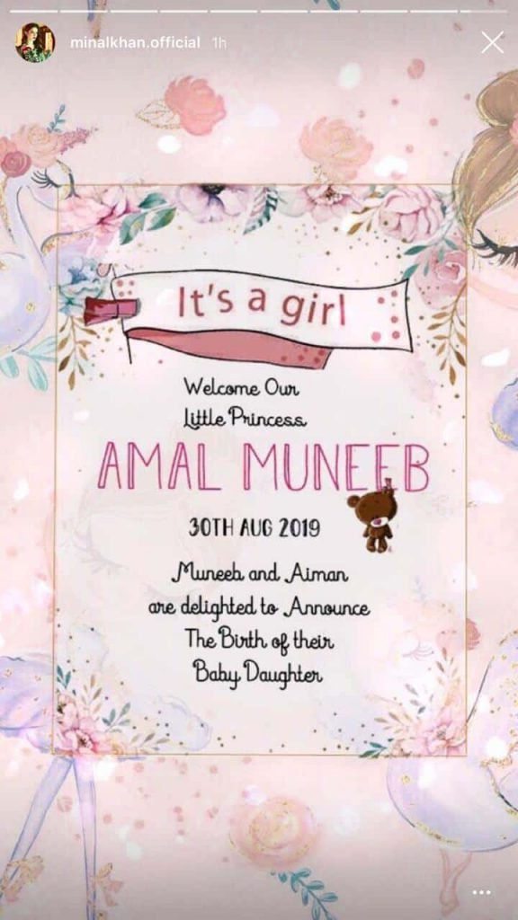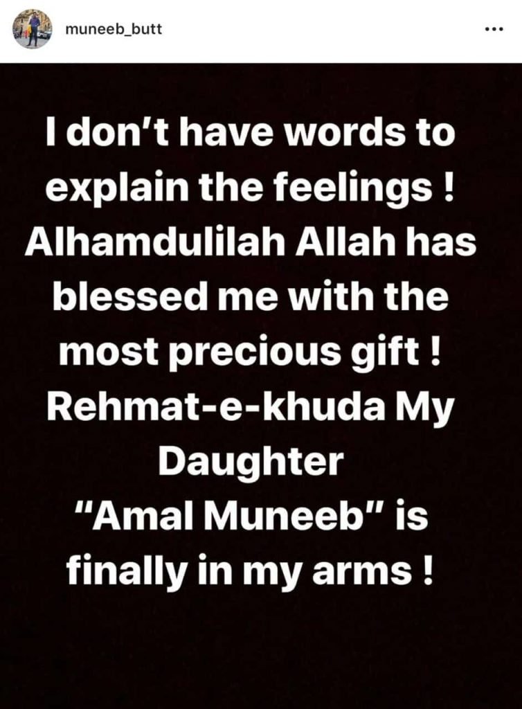 Muneeb Butt took to Instagram to announce the birth of their daughter Amal Muneeb and even shared a picture with her.